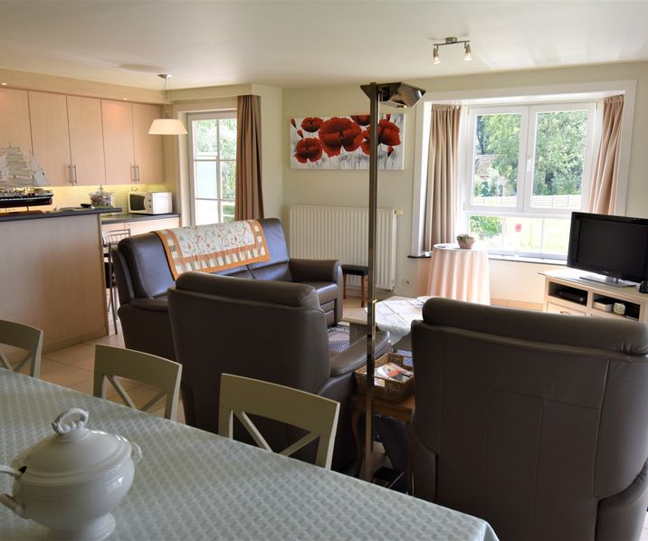 Inkom met ingemaakte vestiairekast, toilet - woonkamer met zithoek voor TV - eetplaats uitgevend op ruim terras - open keuken:volledig ingericht, uitgevend op klein terras - ruime berging met aansluiting wasmachine en droogkast - badkamer met lavabo in meubel en combi ligbad/douche - 3 slaapkamers