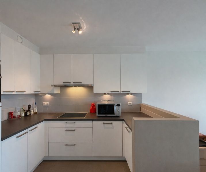 Inkomhal (7m2) met toilet en lavabo - berging (2m2) - mooie leefruimte (33m2) met open keuken ingericht met een keramische kookplaat, combi-oven, vaatwas, frigo, spoelbak en kasten - terras (5,9m2) - twee slaapkamers (8m2, 10m2) met laminaat - badkamer (4m2) met ligbad/douche en lavabomeubel
