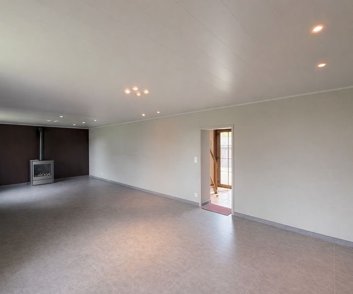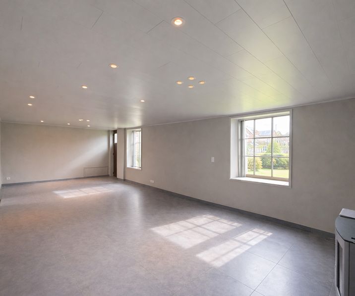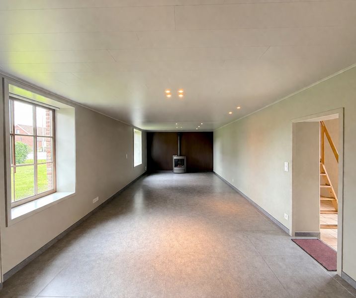 Leefruimte/living (32m2) met moderne gaskachel - keuken (10m2) ingericht met een elektrische kookplaat, oven, dampkap, frigo en kasten - badkamer met toilet, douche en meubel met lavabo, spiegel, kast en blad in graniet - aangelegde tuin (zuid-west oriëntatie)